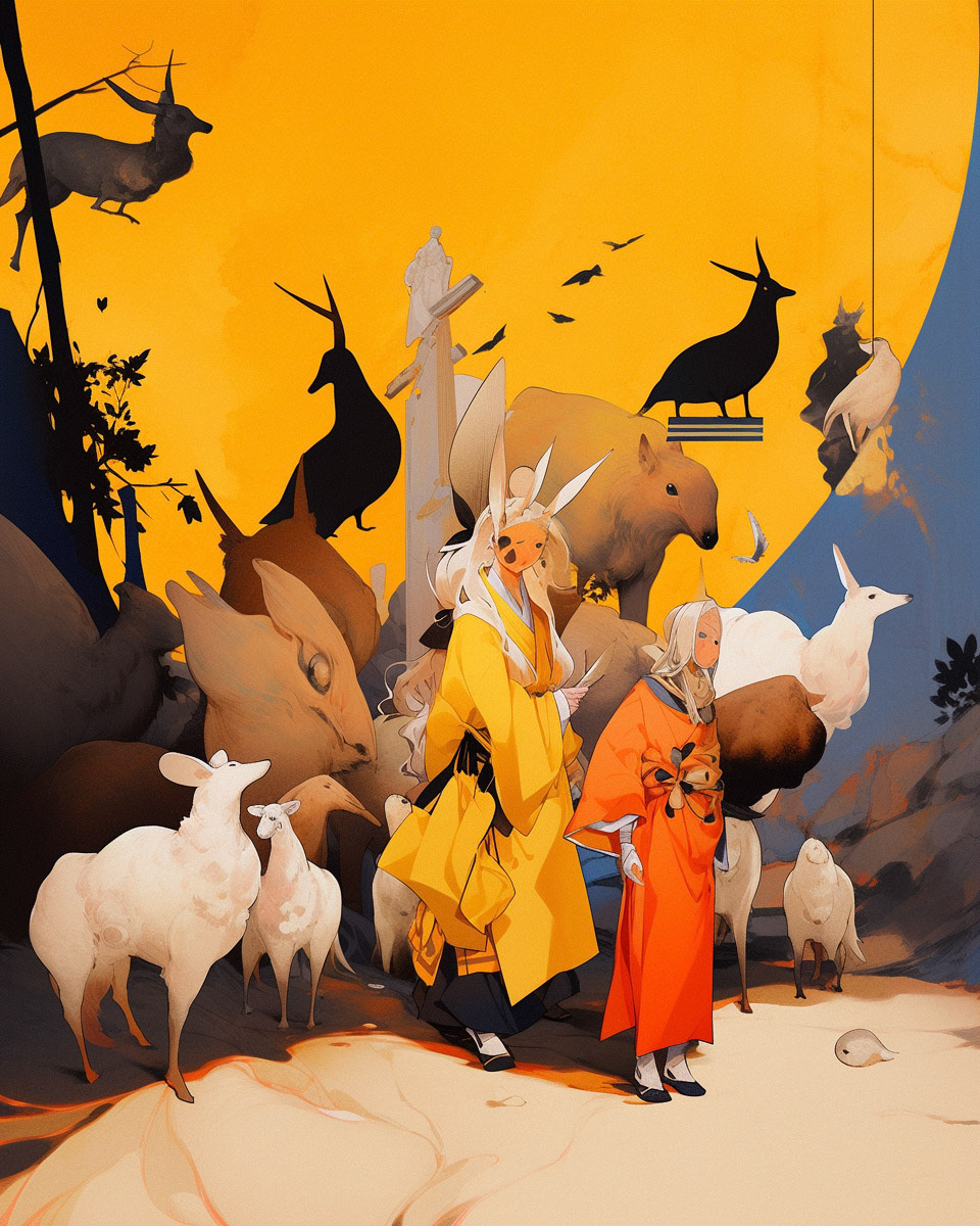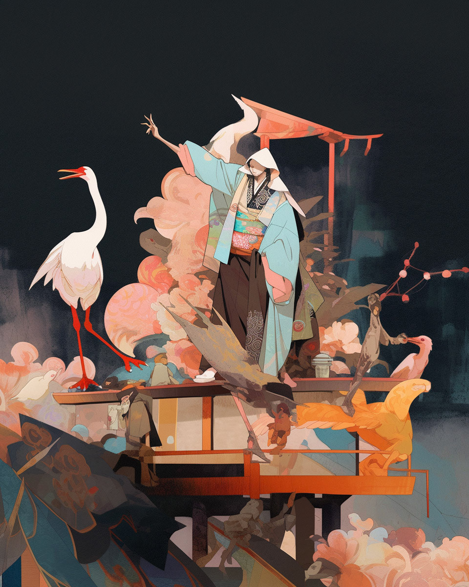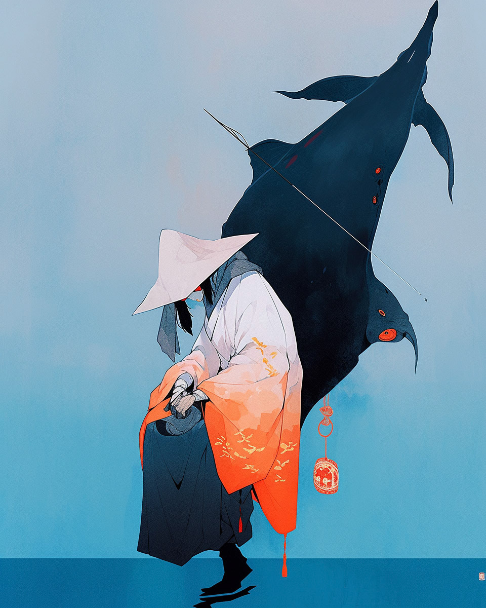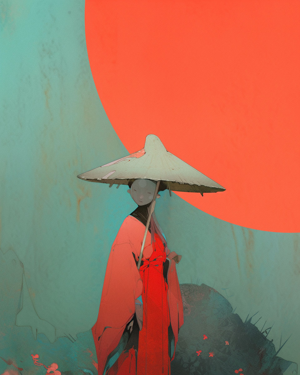 Ukiyo graphics reimagined: A modern canvas unfolds with minimal hues, surreal landscapes, and enigmatic inhabitants. Each frame is a visual haiku, a contemporary ode to the ethereal beauty of traditional Japanese artistry.