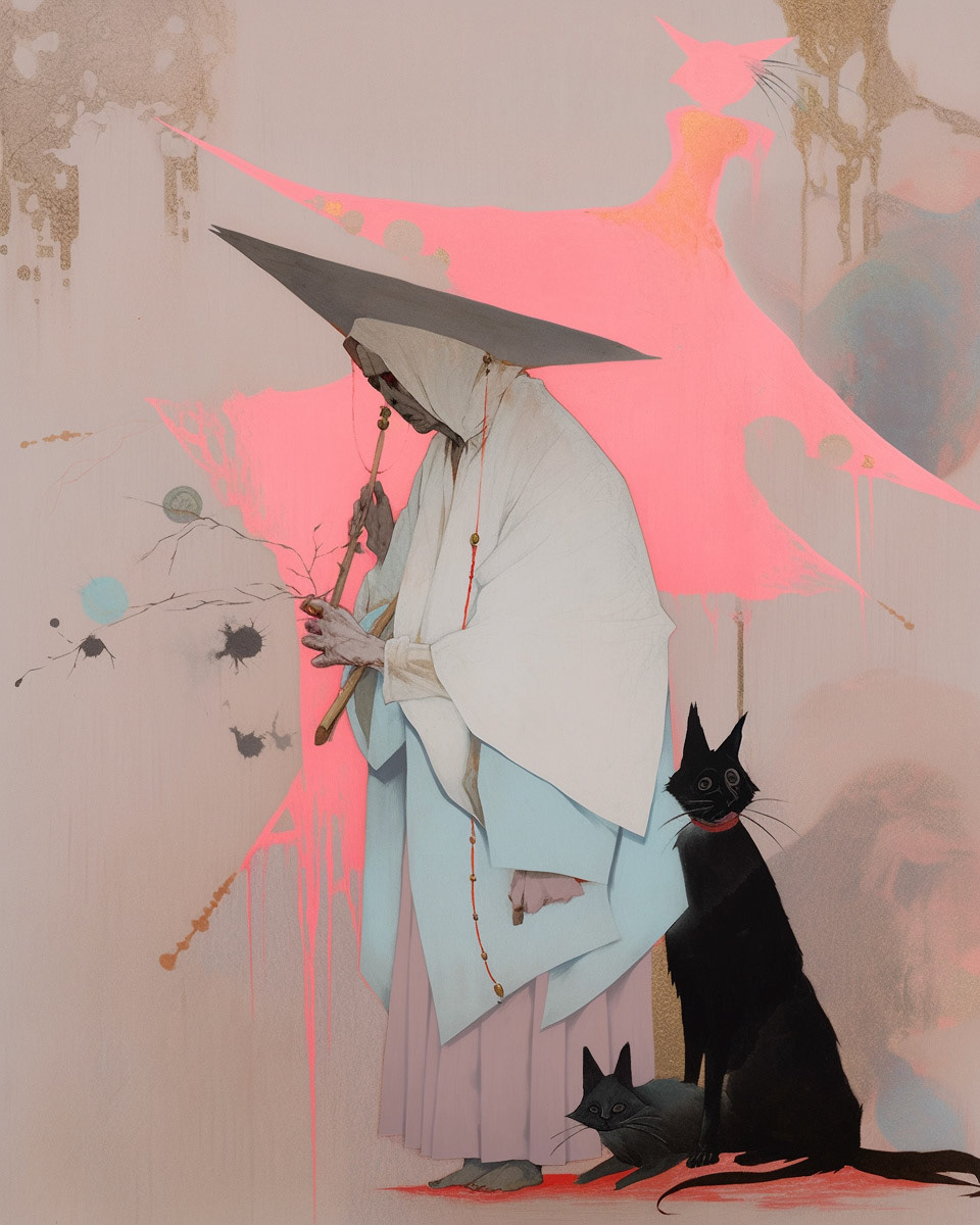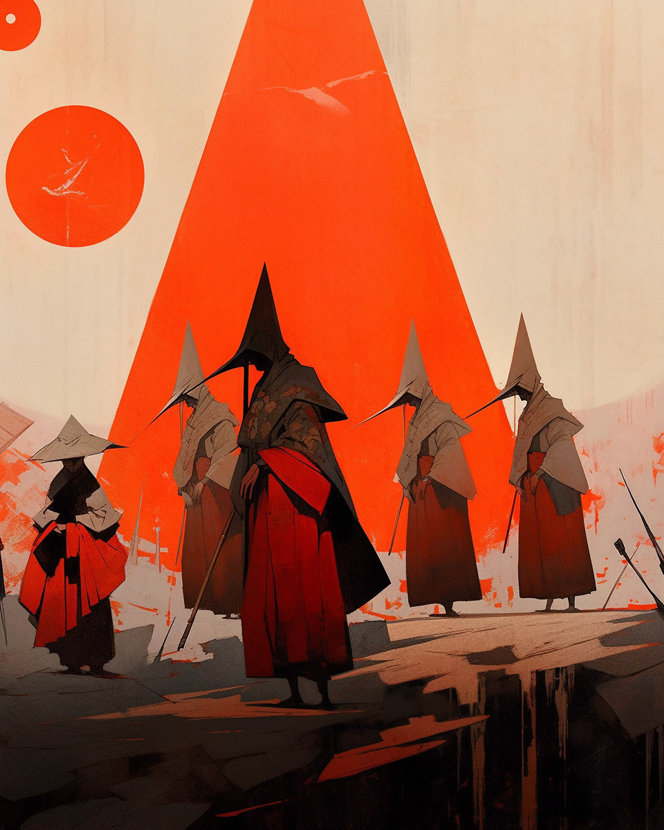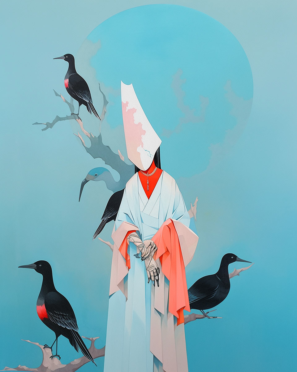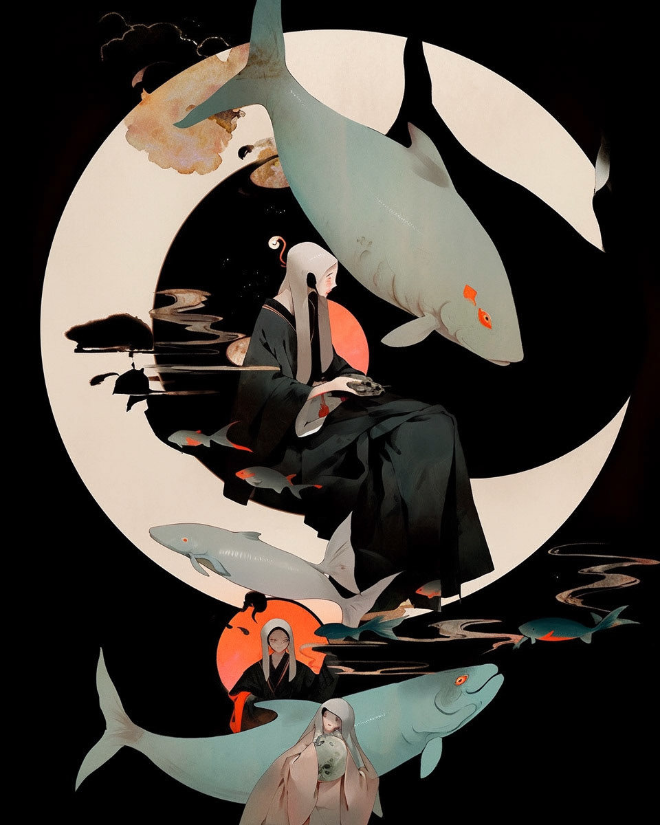 Ukiyo graphics reimagined: A modern canvas unfolds with minimal hues, surreal landscapes, and enigmatic inhabitants. Each frame is a visual haiku, a contemporary ode to the ethereal beauty of traditional Japanese artistry.