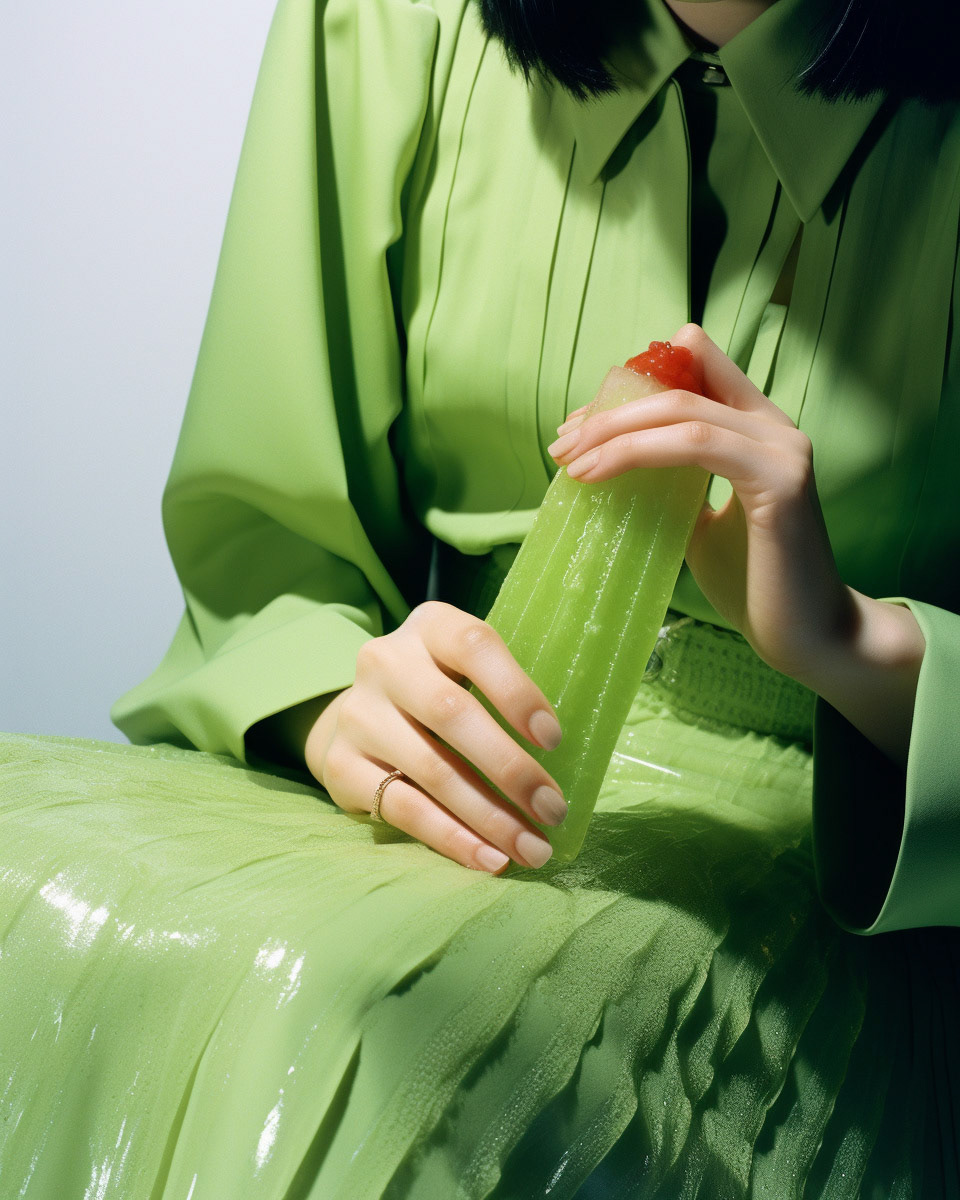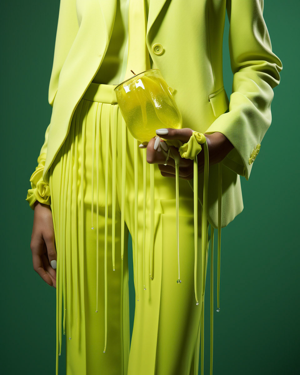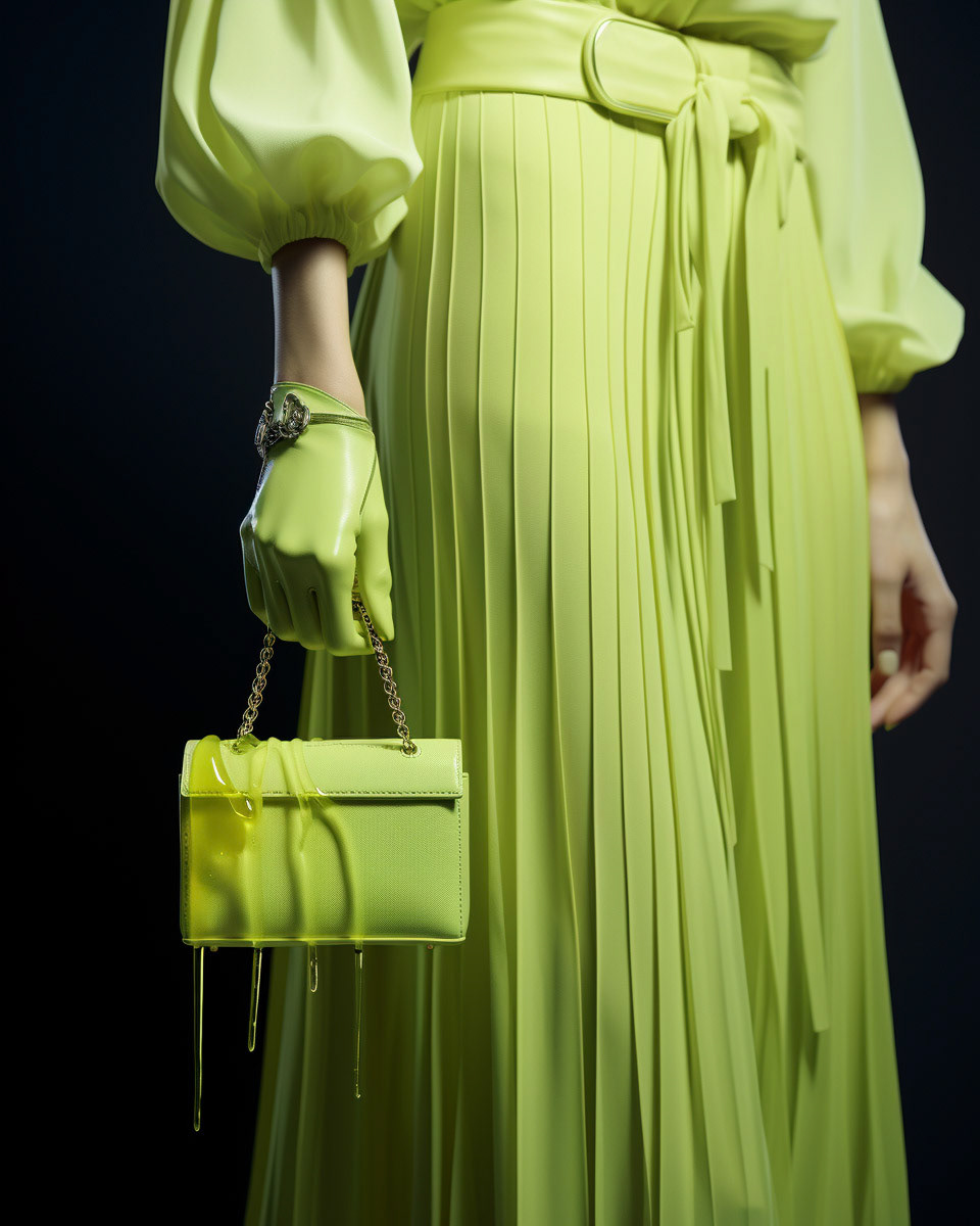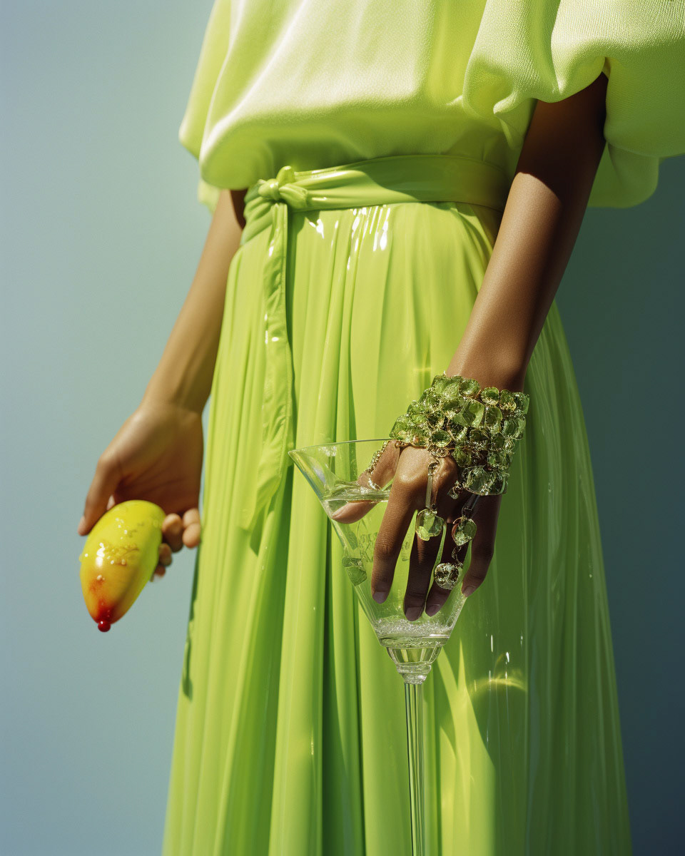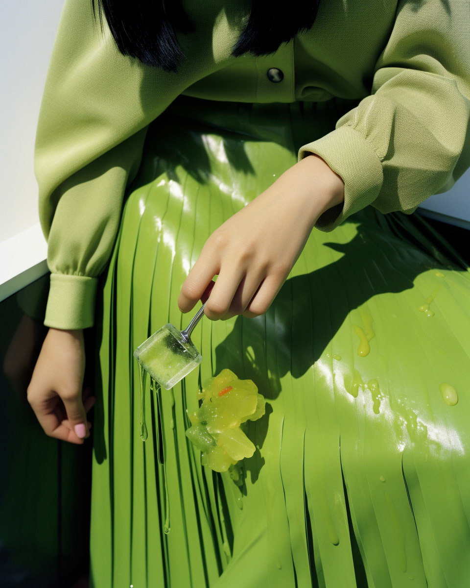 Lime green indulgence: Fashion takes on a delicious twist, evoking the sensuality of liquid ice cream. A palette that's as vibrant as it is tempting, as styles melt seamlessly into a visual treat, capturing the essence of summer's cool allure.