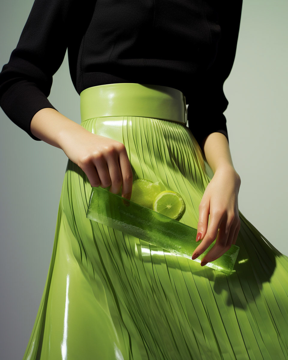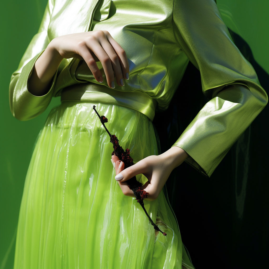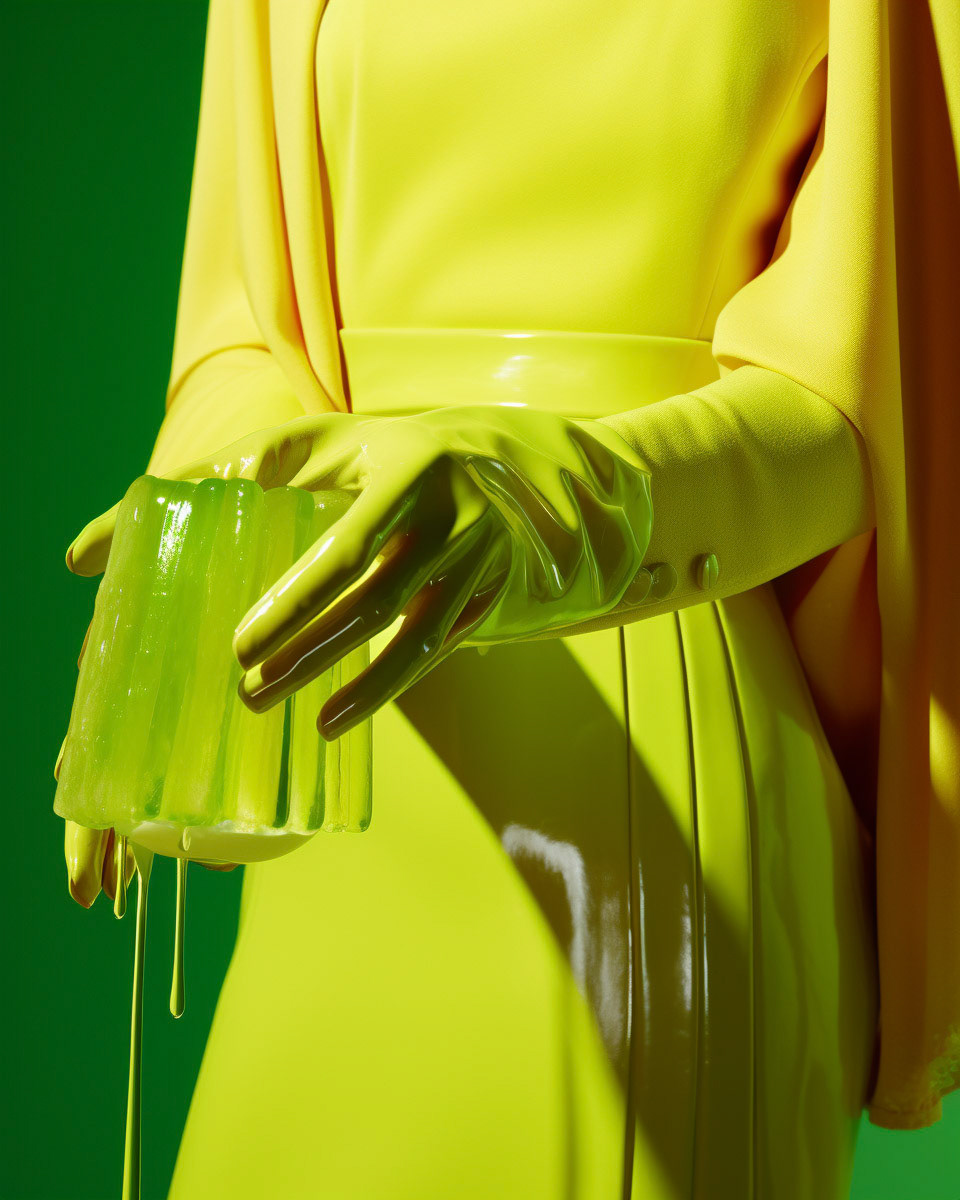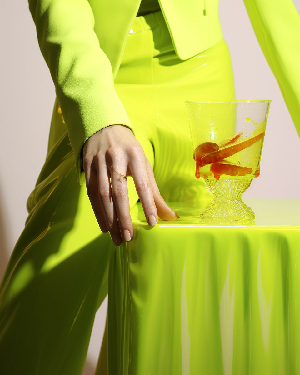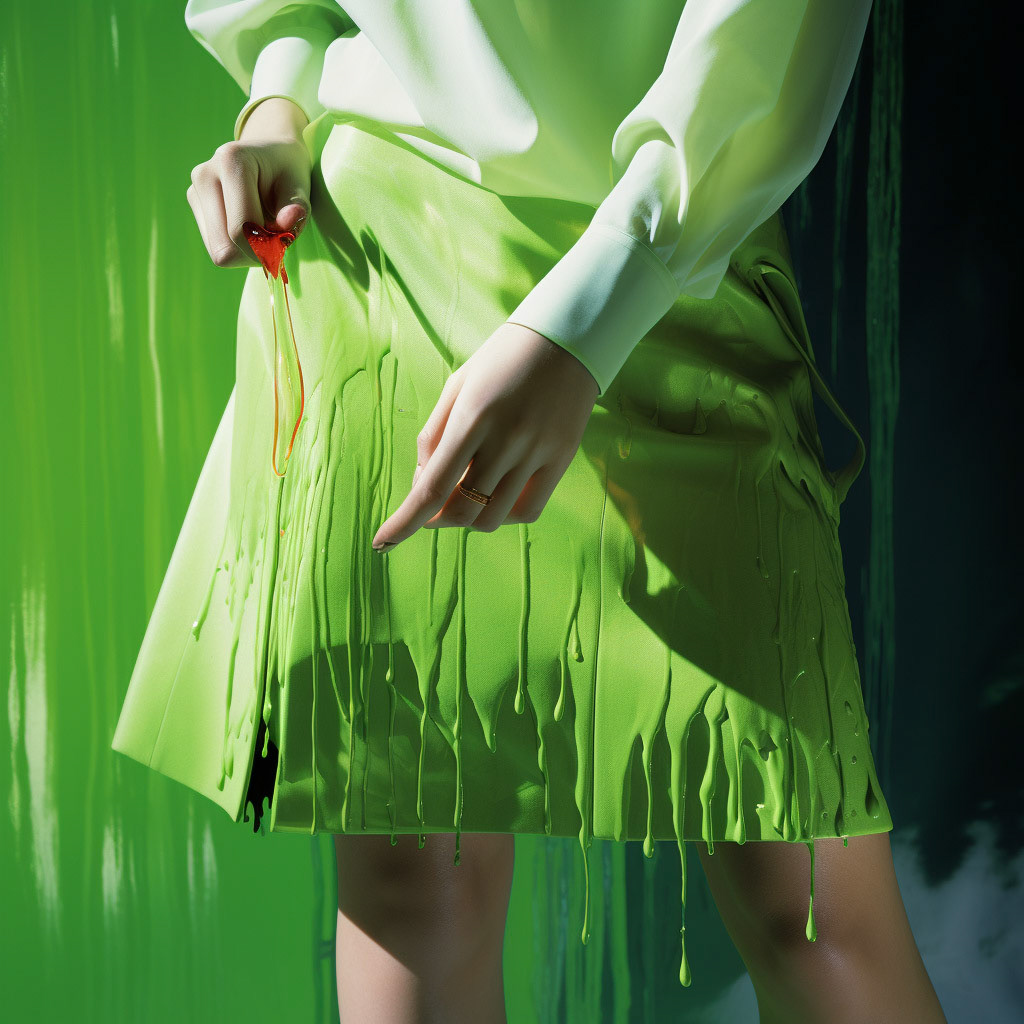 Lime green indulgence: Fashion takes on a delicious twist, evoking the sensuality of liquid ice cream. A palette that's as vibrant as it is tempting, as styles melt seamlessly into a visual treat, capturing the essence of summer's cool allure.