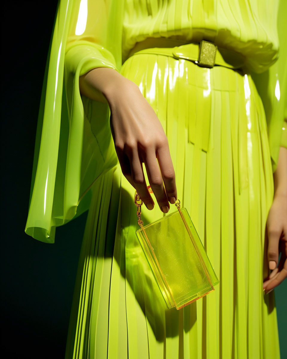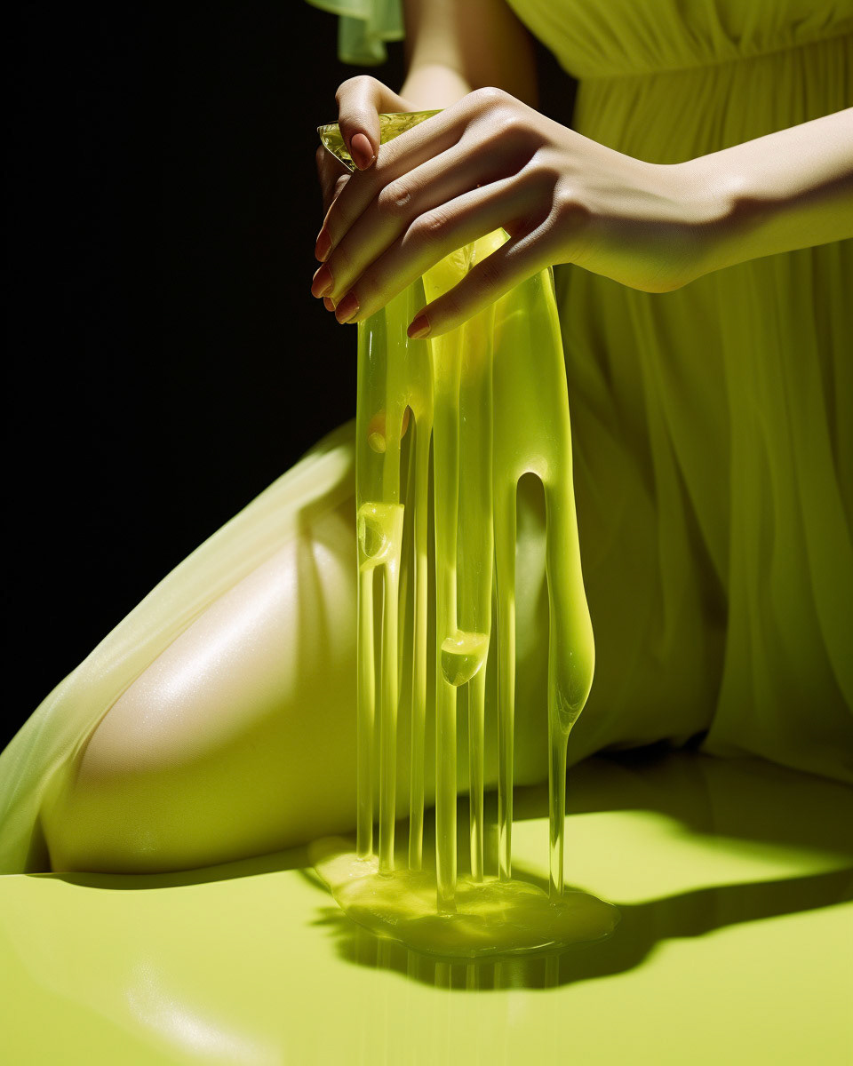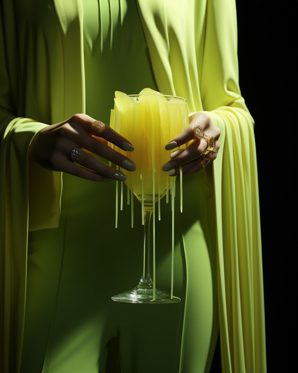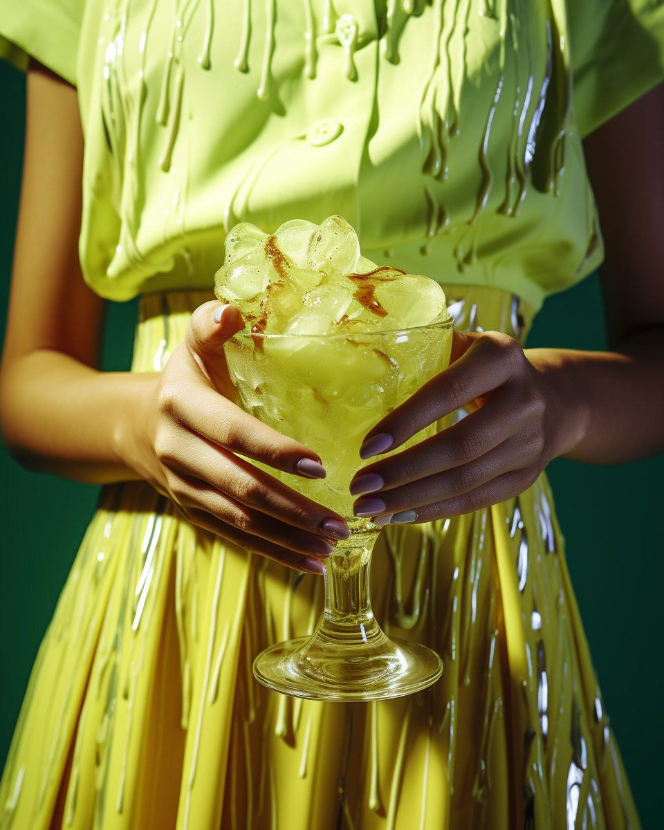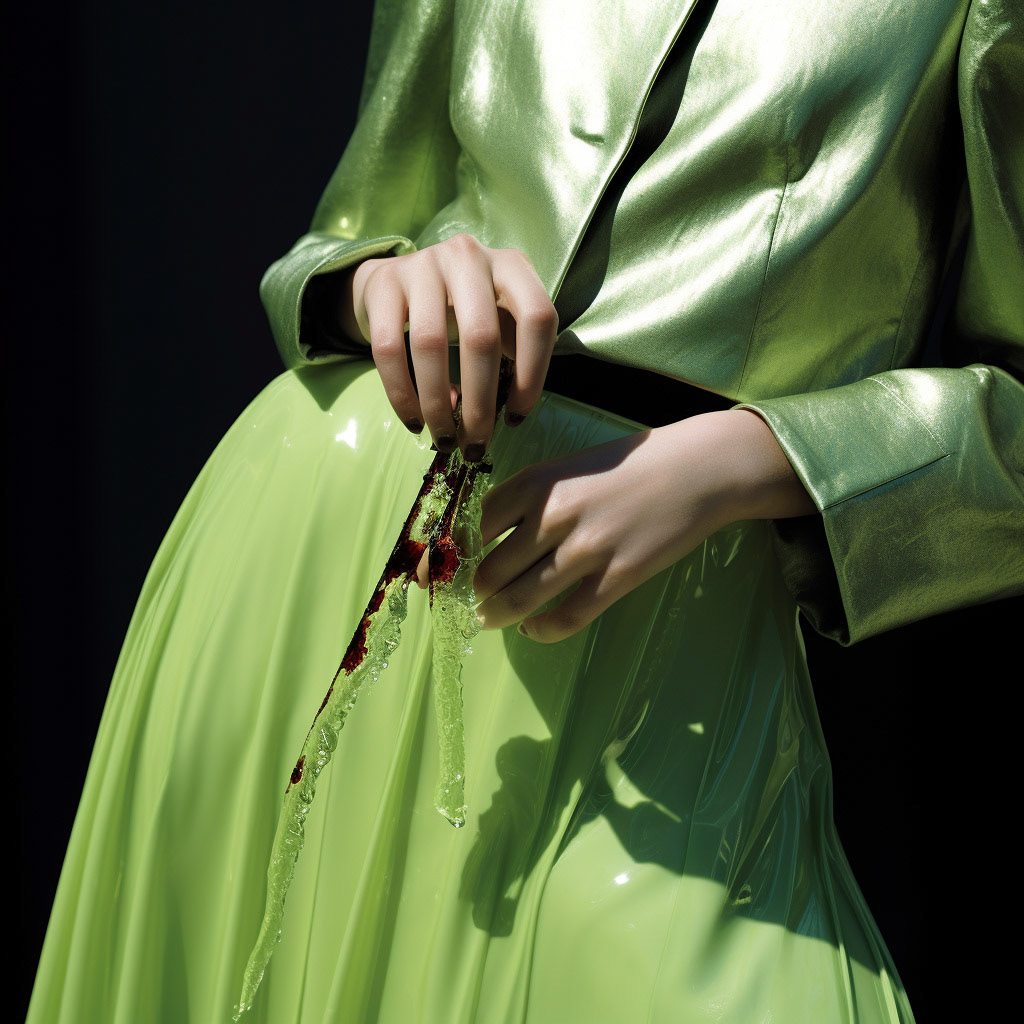 Lime green indulgence: Fashion takes on a delicious twist, evoking the sensuality of liquid ice cream. A palette that's as vibrant as it is tempting, as styles melt seamlessly into a visual treat, capturing the essence of summer's cool allure.