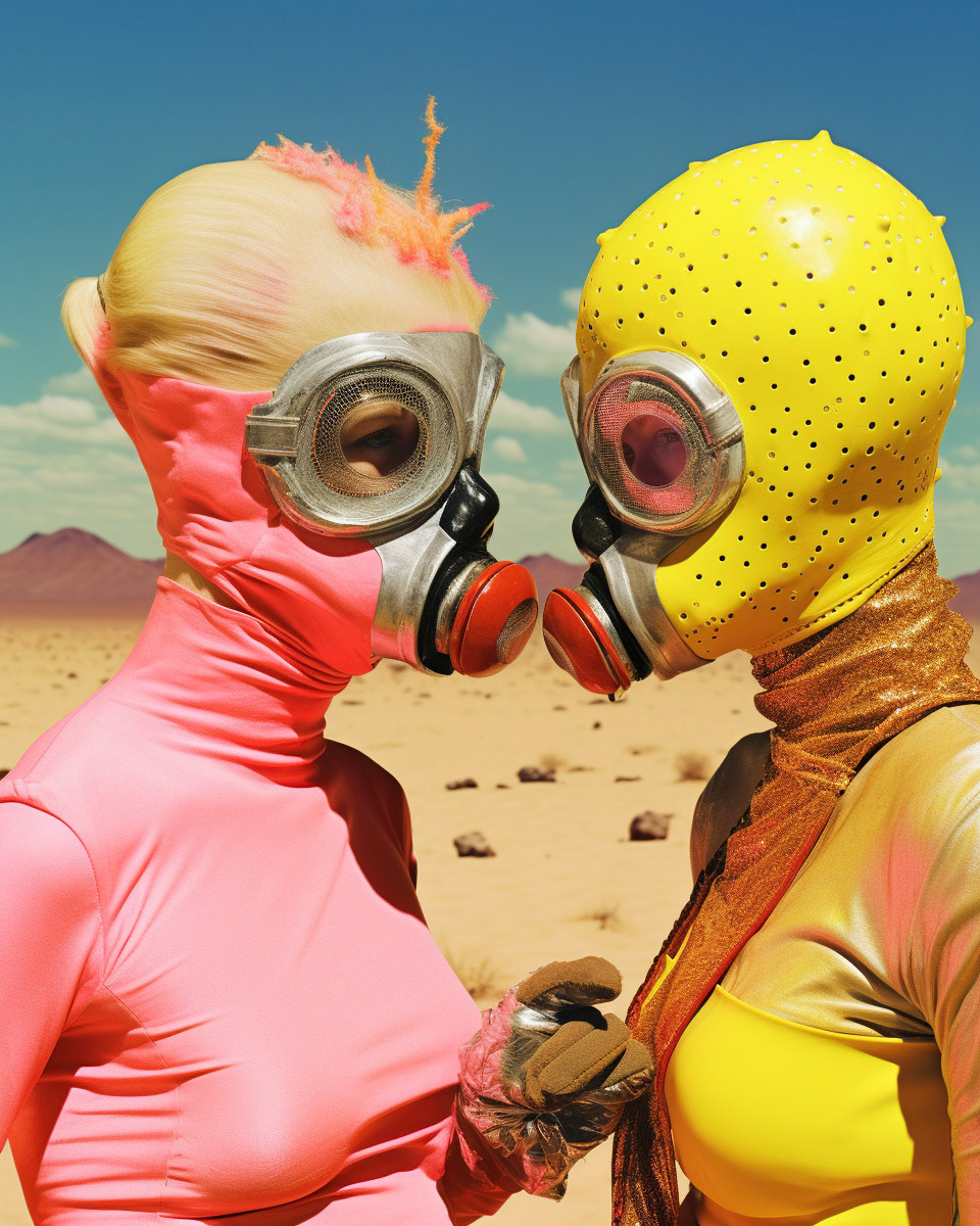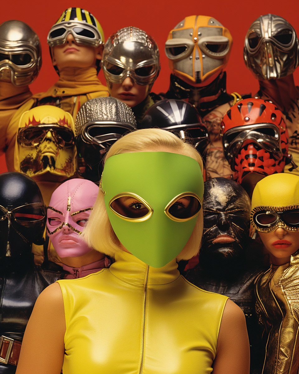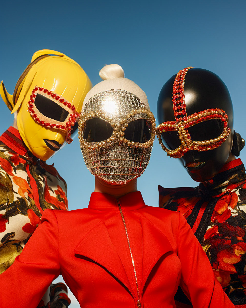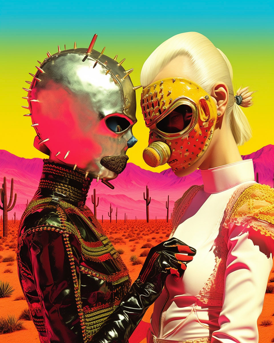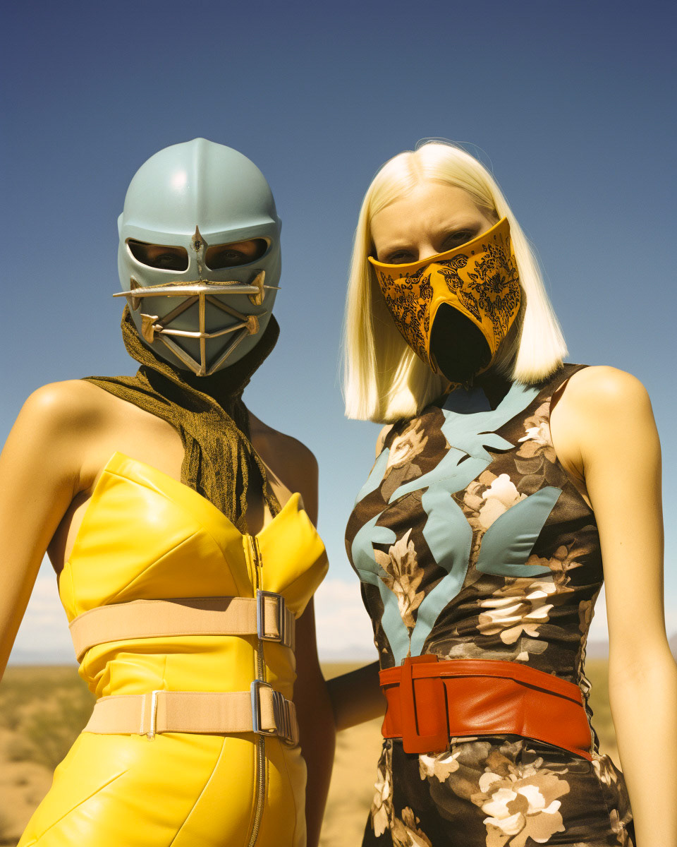Comic novel allure in the desert heat: Fashion takes a whimsical turn with peculiar masks. A surreal dance of style and humor unfolds against the arid landscape, crafting an eccentric narrative that blurs the lines between fantasy and high fashion.