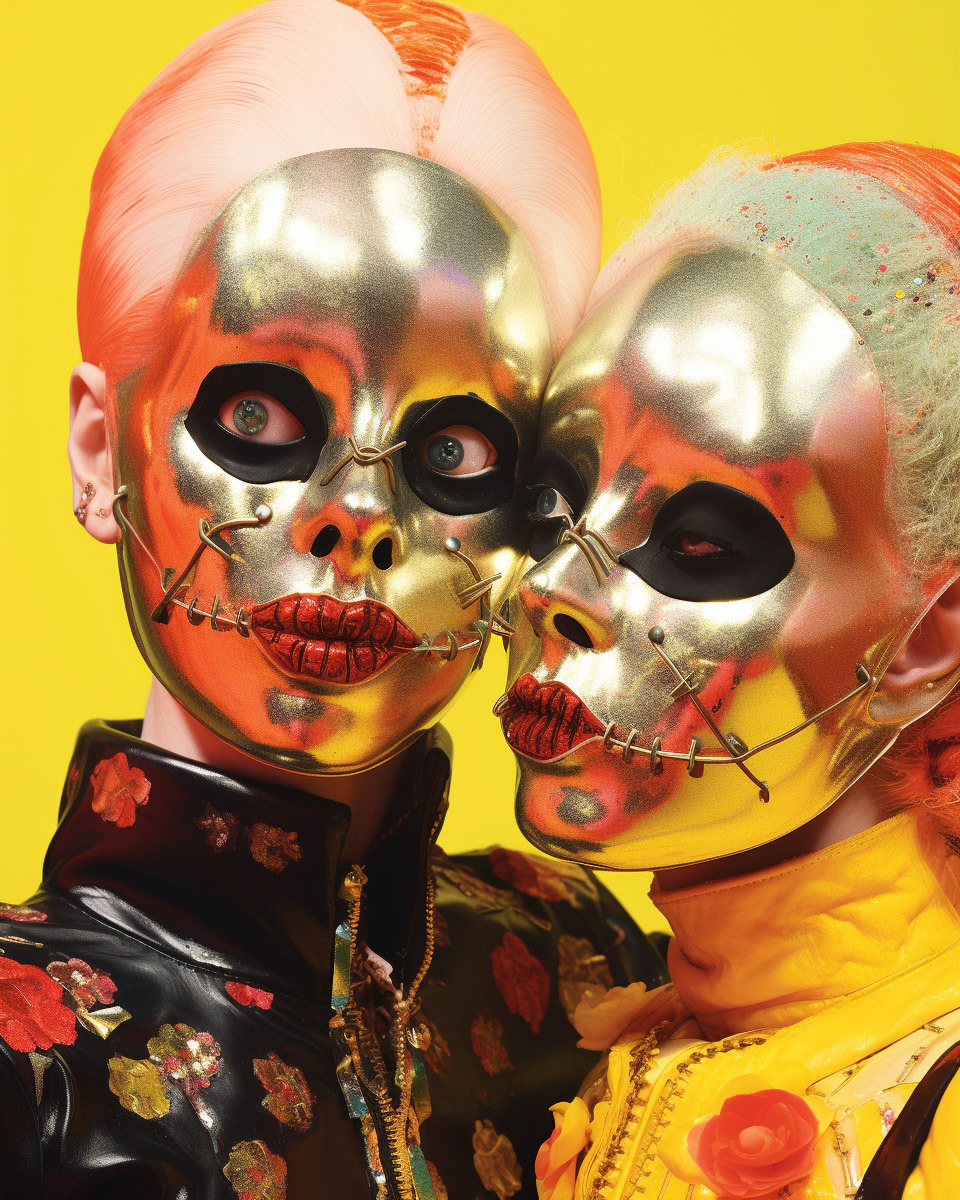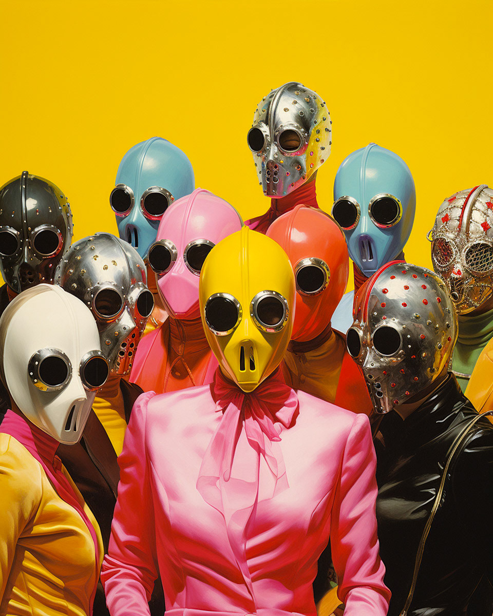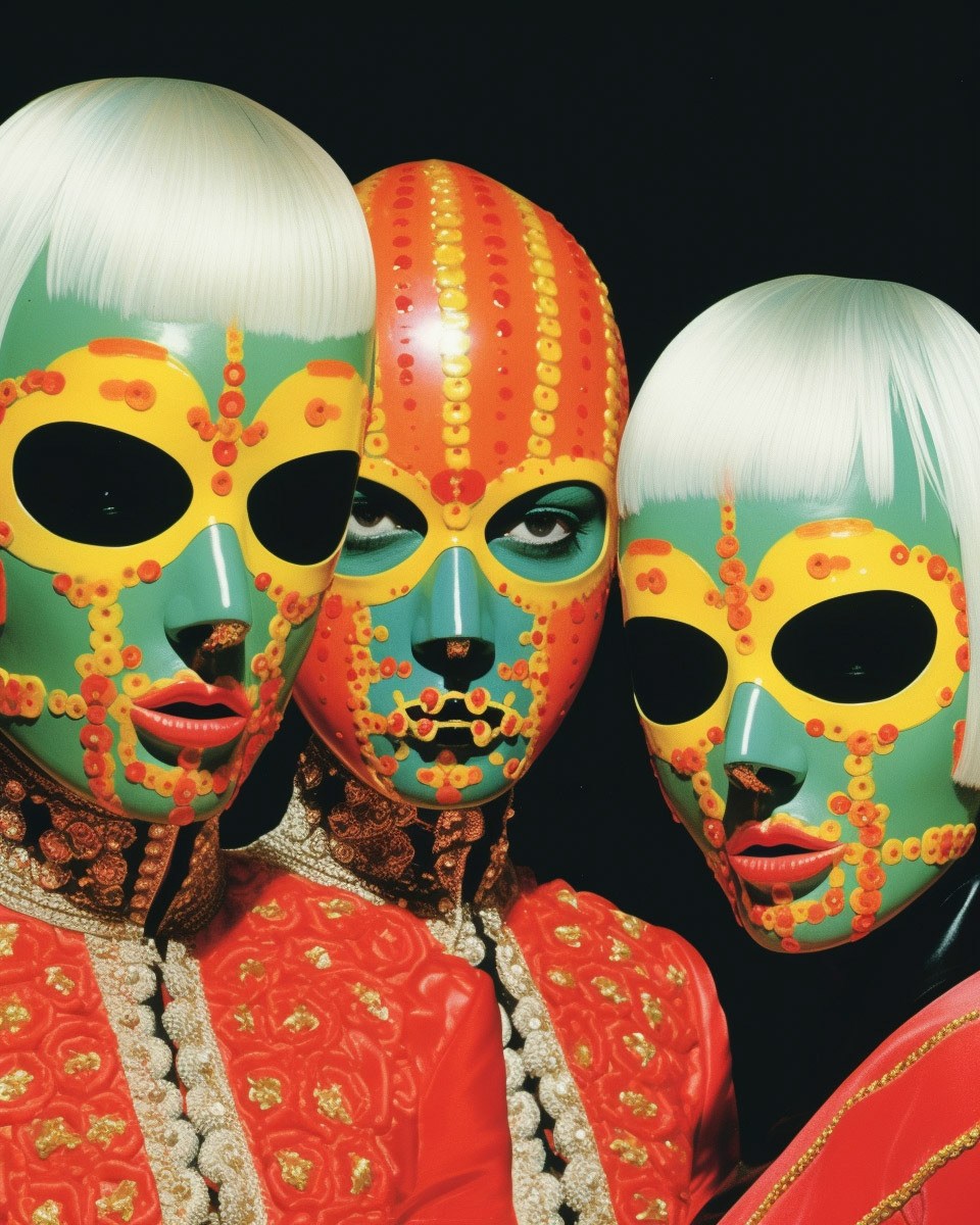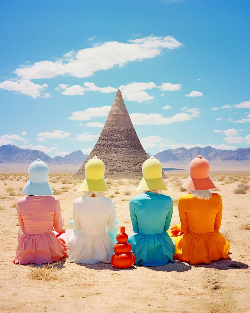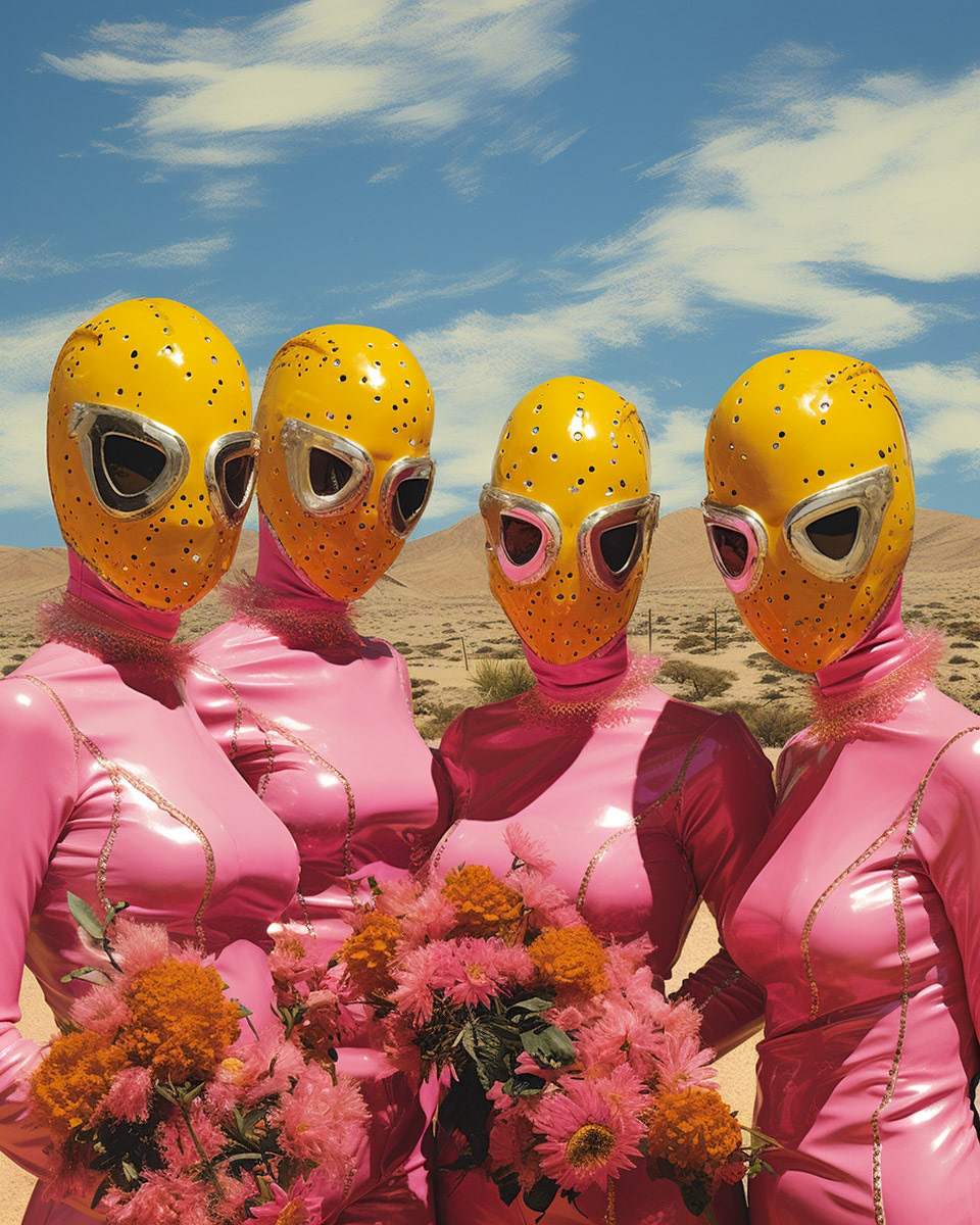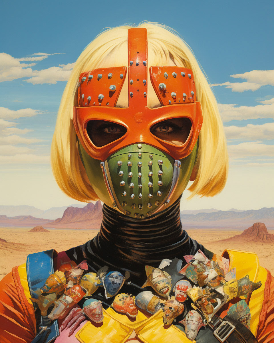 Comic novel allure in the desert heat: Fashion takes a whimsical turn with peculiar masks. A surreal dance of style and humor unfolds against the arid landscape, crafting an eccentric narrative that blurs the lines between fantasy and high fashion.