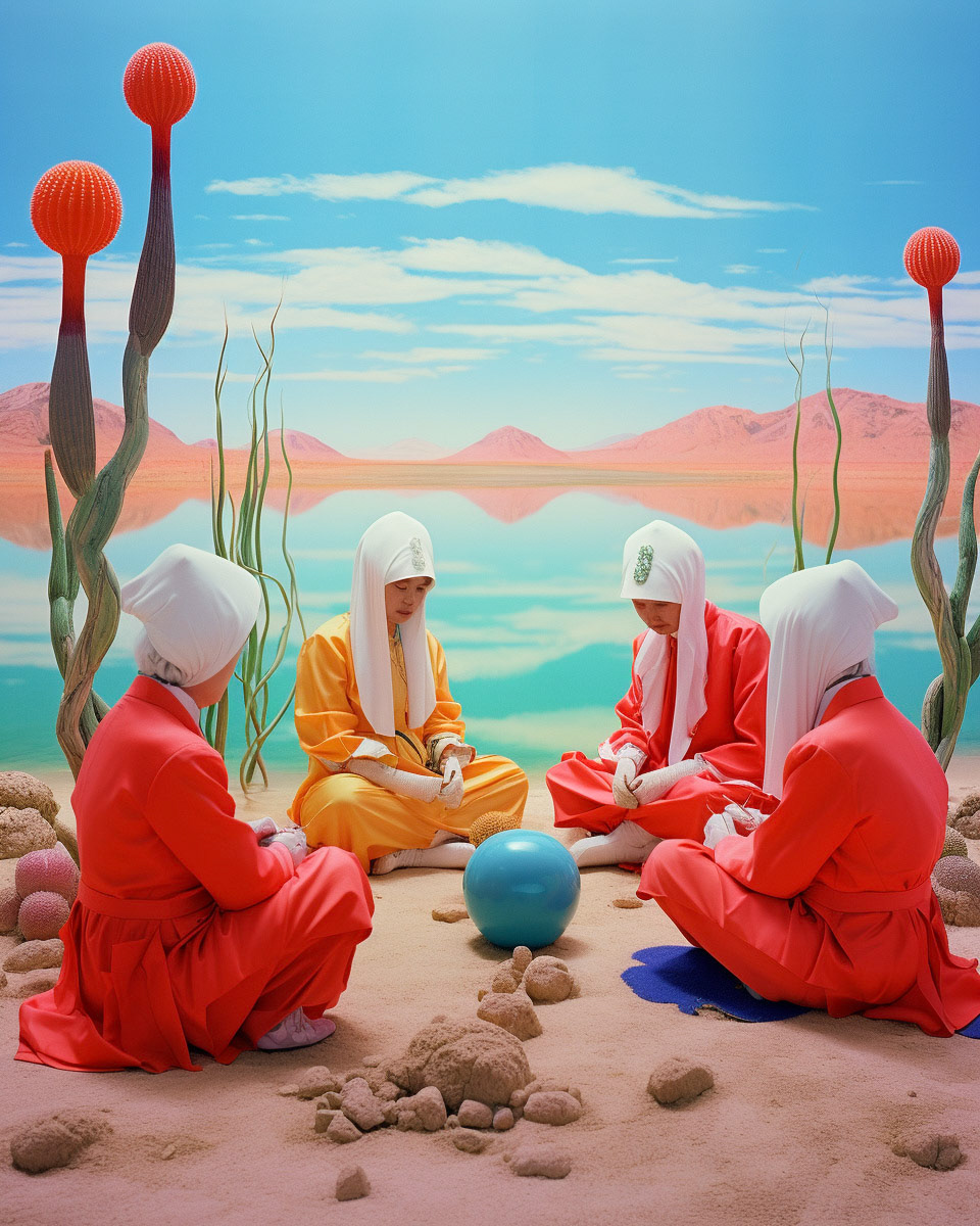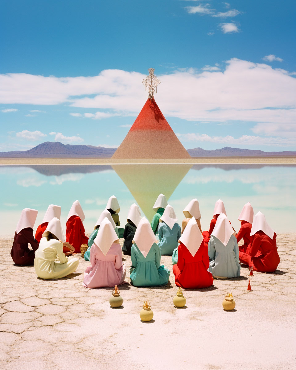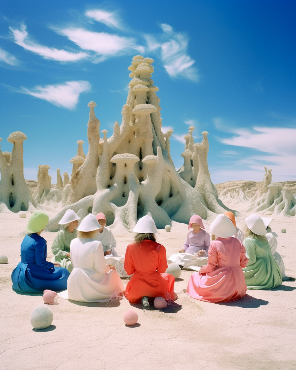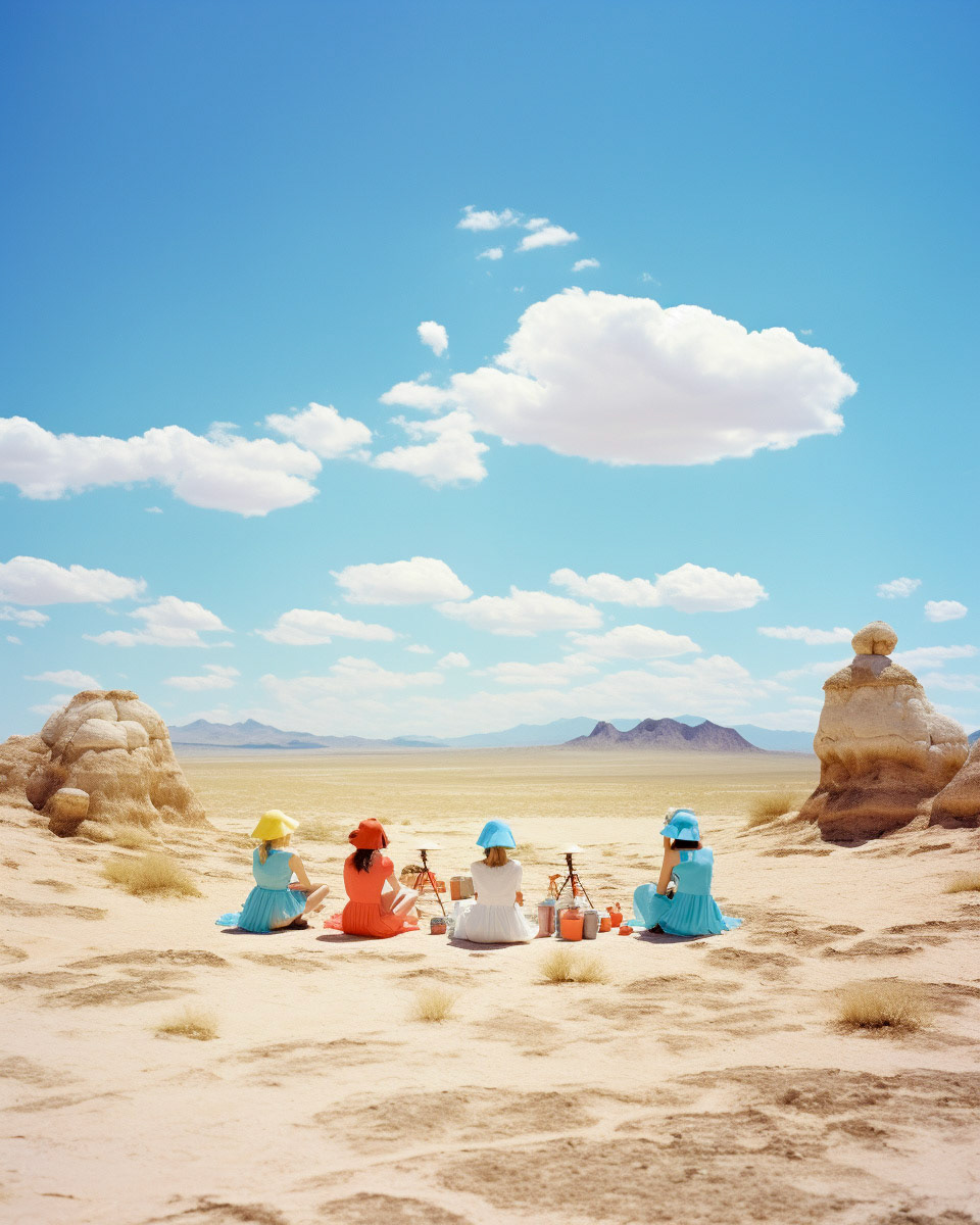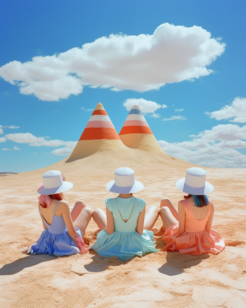 Comic novel allure in the desert heat: Fashion takes a whimsical turn with peculiar masks. A surreal dance of style and humor unfolds against the arid landscape, crafting an eccentric narrative that blurs the lines between fantasy and high fashion.