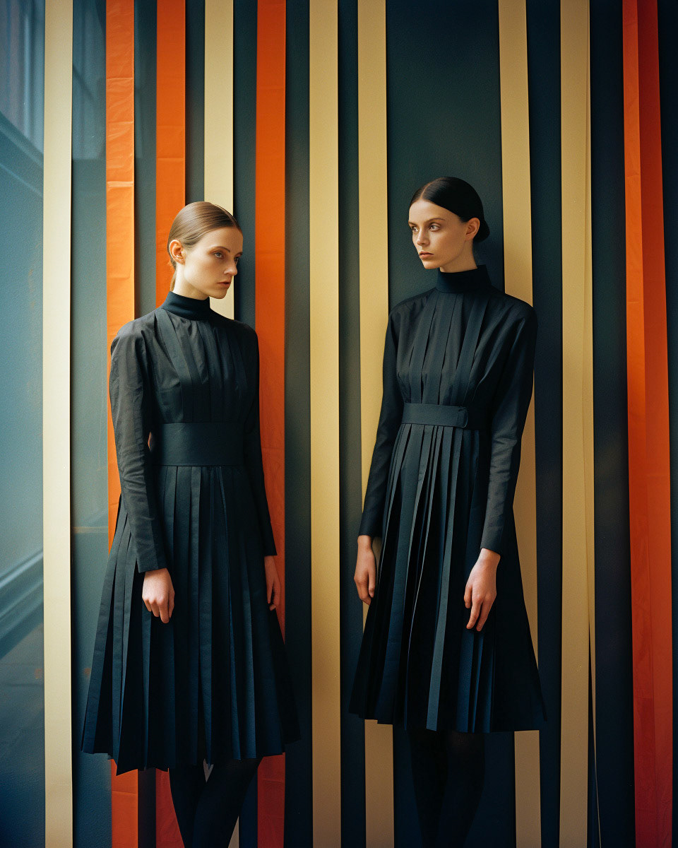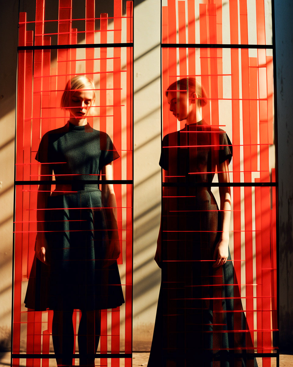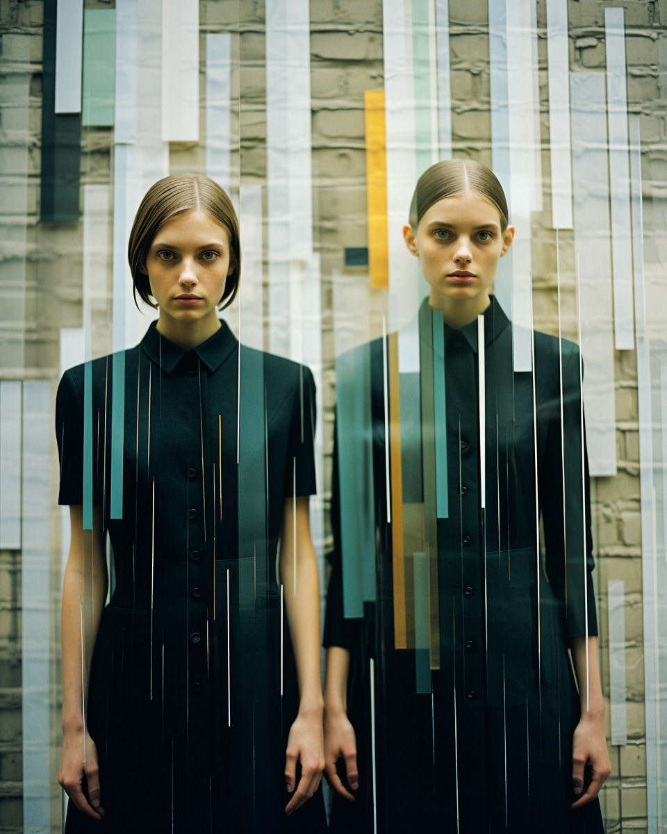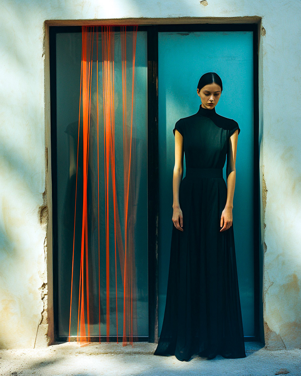 Experimental fashion photography meets nuanced vertical set design and graphic elements. A subtle interplay of form and style challenges conventions, creating a captivating visual dialogue in this evolving intersection between disciplines.