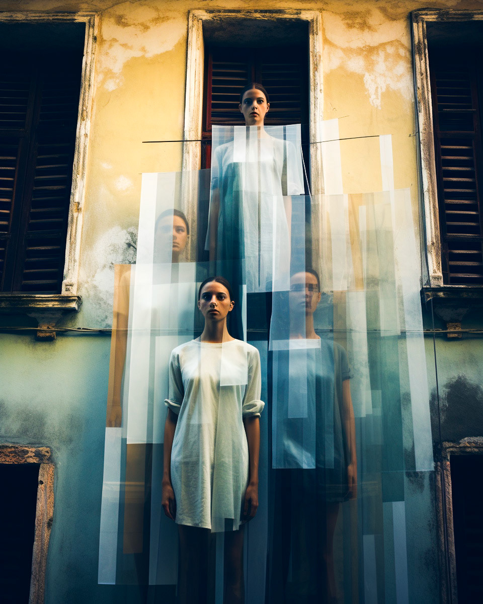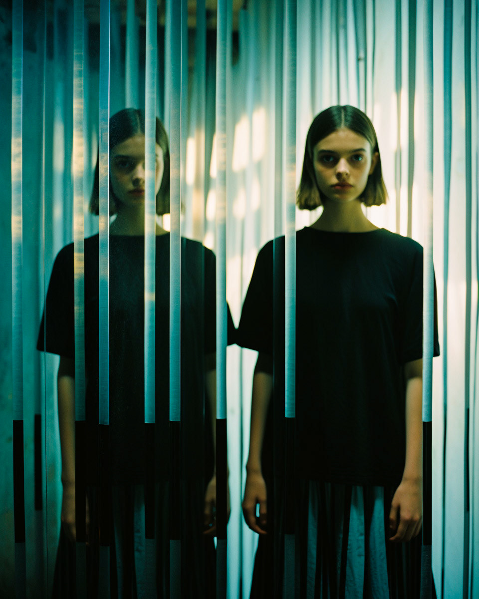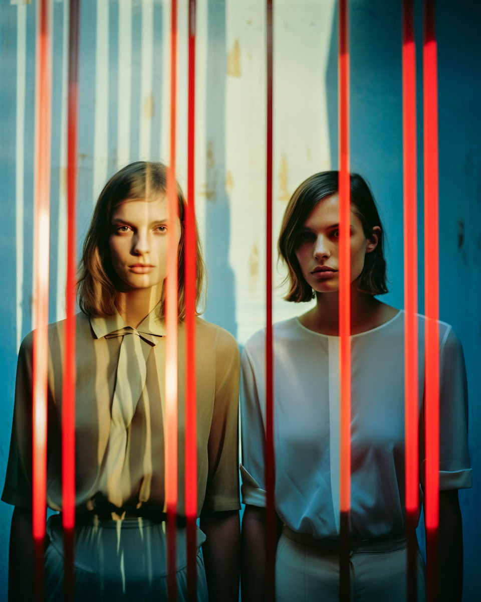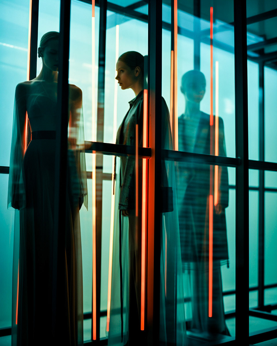 Experimental fashion photography meets nuanced vertical set design and graphic elements. A subtle interplay of form and style challenges conventions, creating a captivating visual dialogue in this evolving intersection between disciplines.
