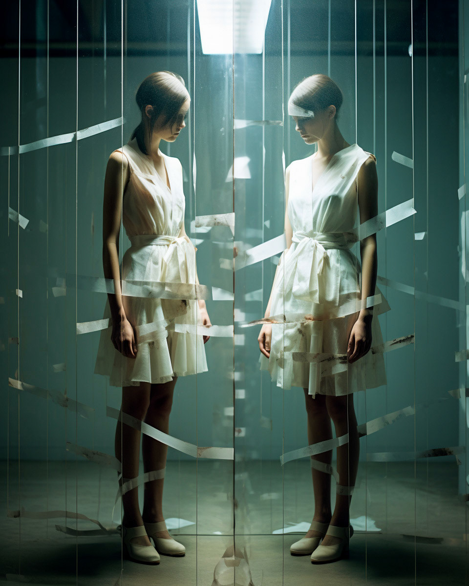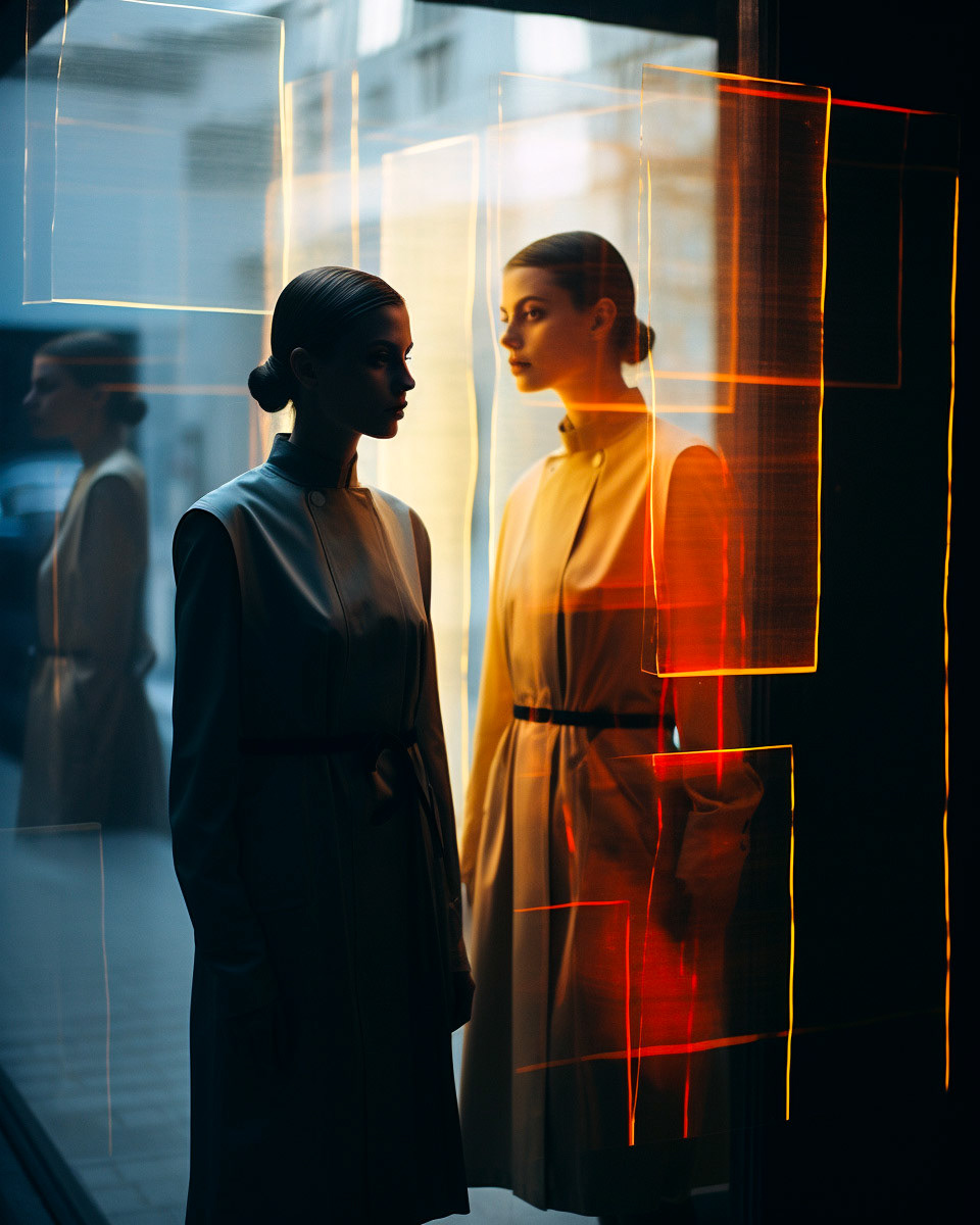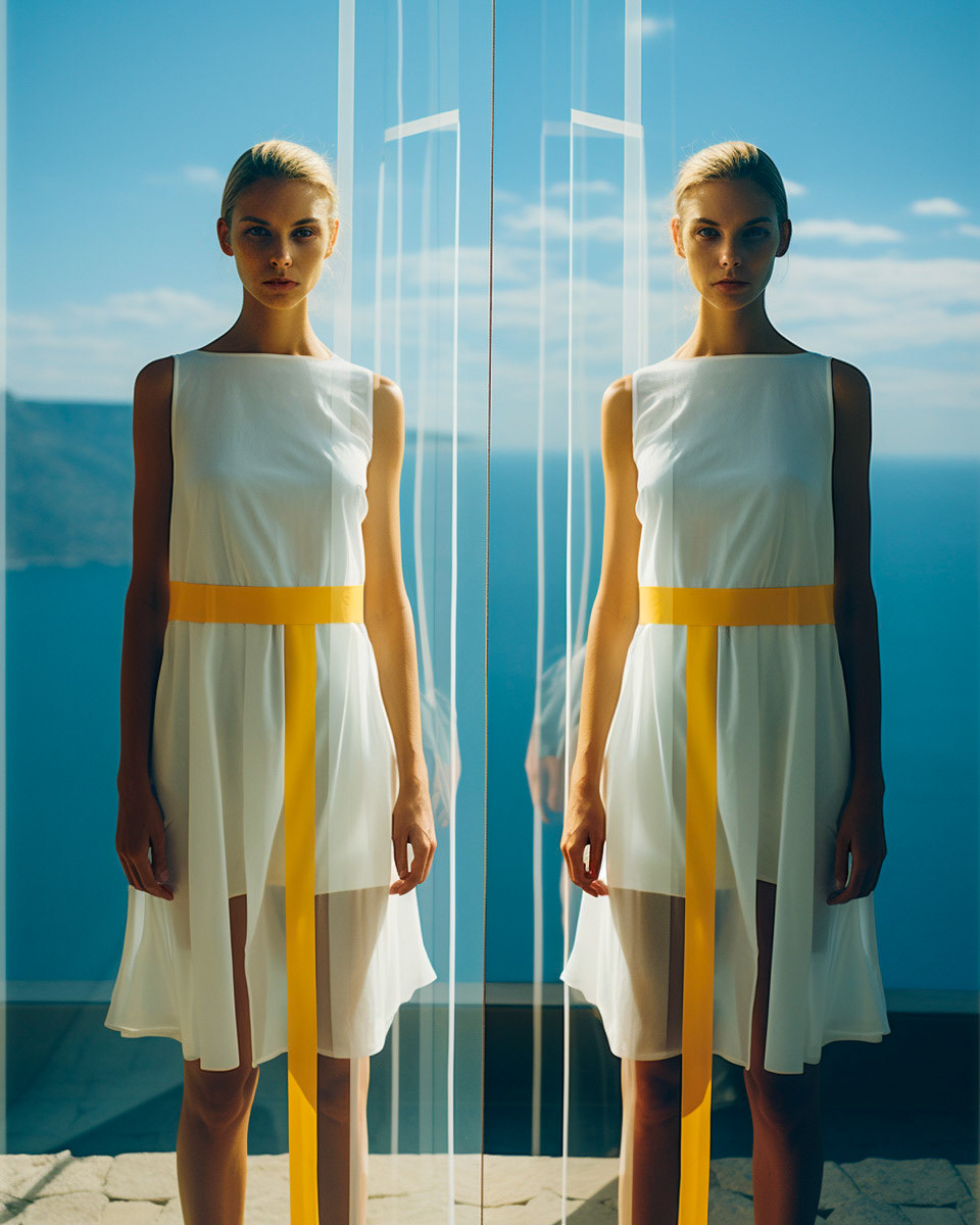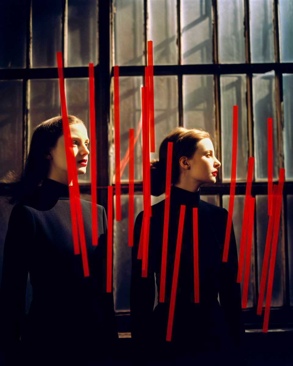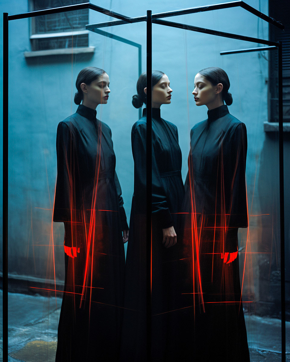 Experimental fashion photography meets nuanced vertical set design and graphic elements. A subtle interplay of form and style challenges conventions, creating a captivating visual dialogue in this evolving intersection between disciplines.
